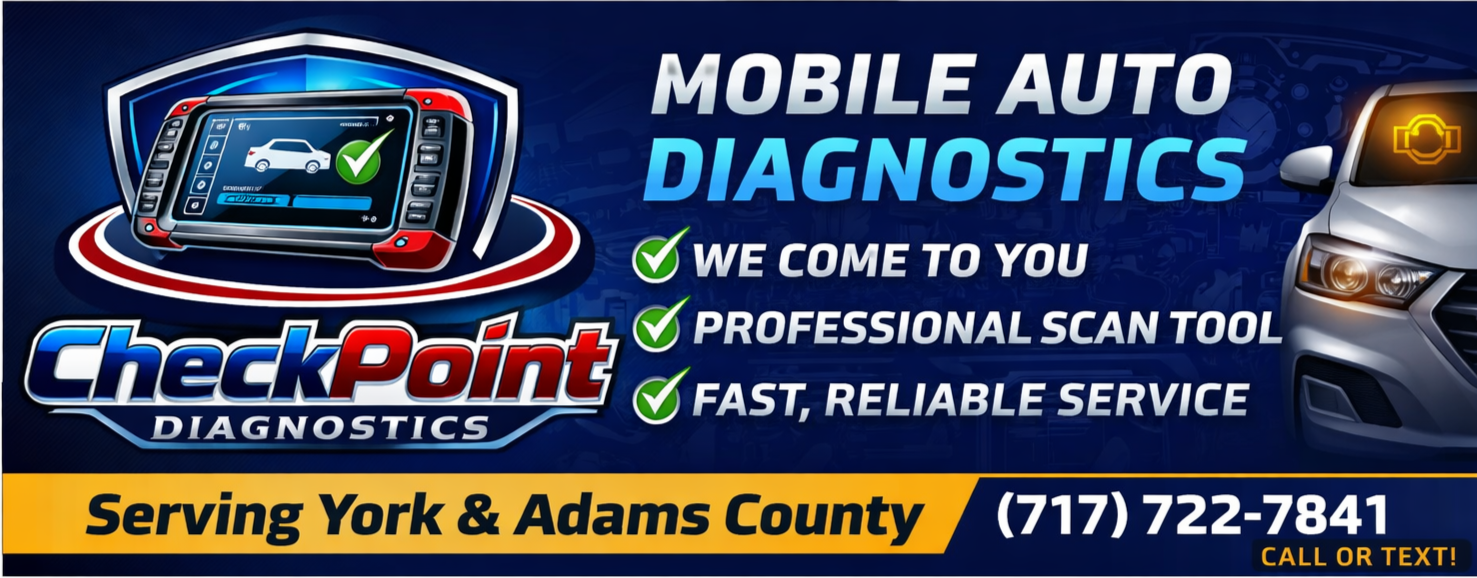 Advertising banner for CheckPoint Diagnostics, a mobile auto diagnostics service. It features a mobile scan tool, car, and a vehicle with a check engine light. The banner states they come to you, have a professional scan tool, and offer fast, reliable service. It includes contact details for York and Adams County with a phone number and a call or text prompt.